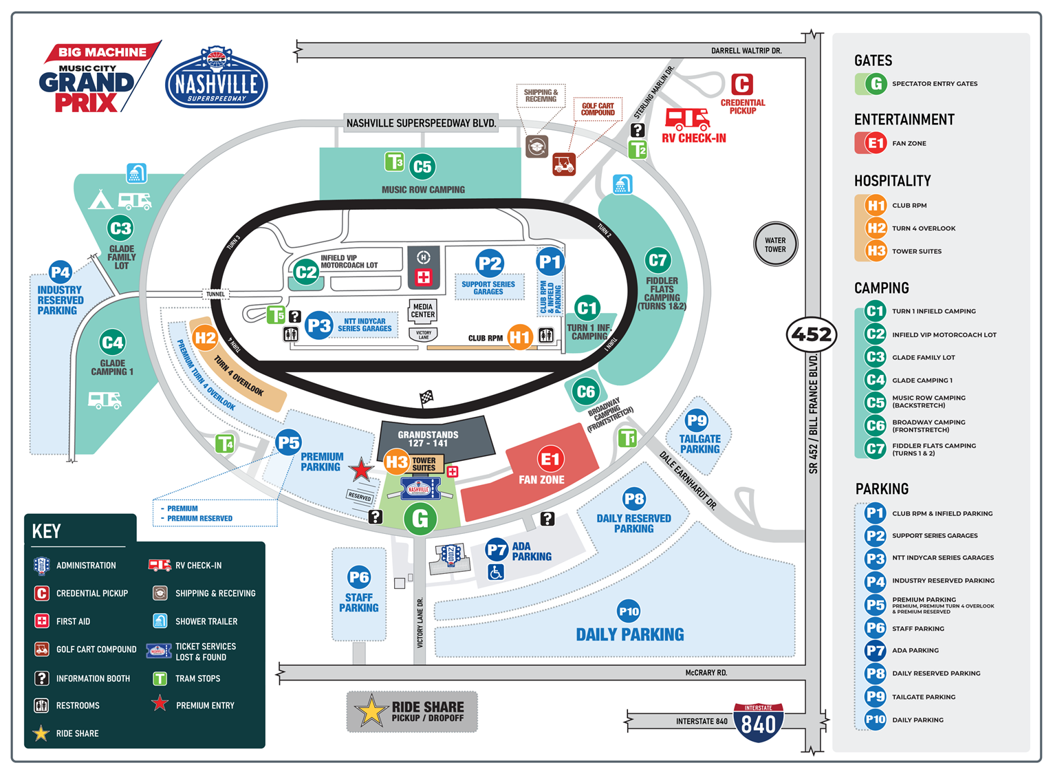 Pass Rules Each camping pass allows one vehicle to access a camping space. A pass without a vehicle is not eligible for any space on site. Additional Tow Vehicle passes may be purchased by calling 866-RACE-TIX Camping is a tradition at Nashville Speedway, and the Borchetta Bourbon Music City Grand Prix INDYCAR Weekend will offer a complete camping experience for fans. All RV camping spaces are approximately 25' x 50' except the Infield VIP Motorcoach lot which is 12’ x 60’ Electric Services Electric hookups are available in the Broadway Campground, Turn 1 Infield, and Infield VIP. Arrival / Exit Guests with camping passes can begin check-in at noon on Friday, August 29th. Guests will need to have departed their camping space by noon on Monday, September 1st.