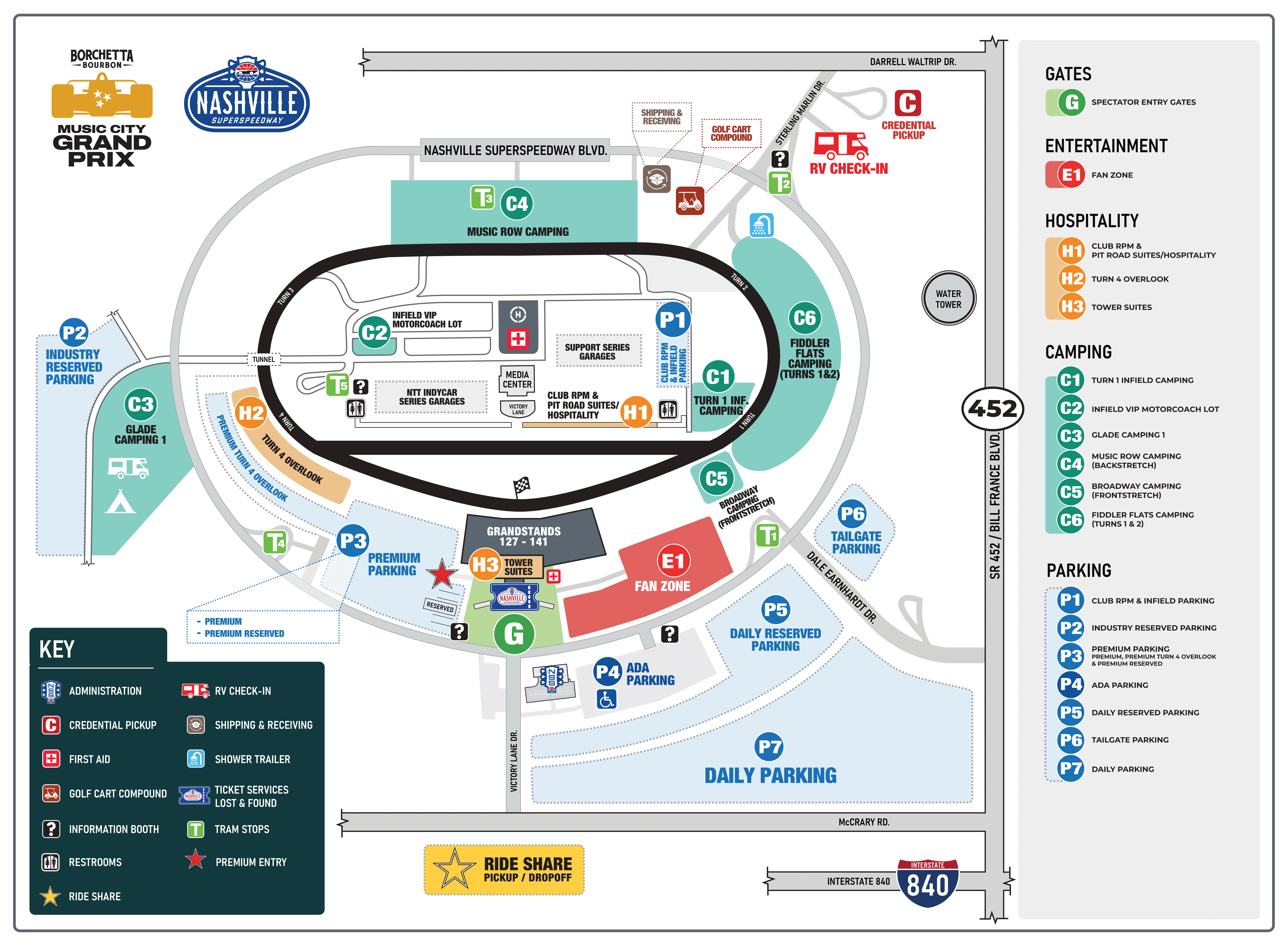Pass Rules Each camping pass allows one vehicle to access a camping space. A pass without a vehicle is not eligible for any space on site. Additional Tow Vehicle passes may be purchased by calling 866-RACE-TIX Camping is a tradition at Nashville Speedway, and the Borchetta Bourbon Music City Grand Prix INDYCAR Weekend will offer a complete camping experience for fans. All RV camping spaces are approximately 25' x 50' except the Infield VIP Motorcoach lot which is 12’ x 60’ Electric Services Electric hookups are available in the Broadway Campground, Turn 1 Infield, and Infield VIP. Arrival / Exit Guests with camping passes can begin check-in at noon on Friday, August 29th. Guests will need to have departed their camping space by noon on Monday, September 1st.